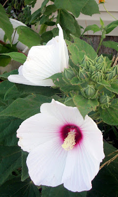 Hibiscus. Beautiful summer flower. It always begins to bloom when the heat turns up. I grew some from seed a few years ago and ended up with three different colors. You don't know what color you'll get, when you start from seed. They don't always remain true to the mother plant. Beautiful flower, very tropical looking. It's my daughter-in-laws favorite. But then, she loves the heat of summer too.